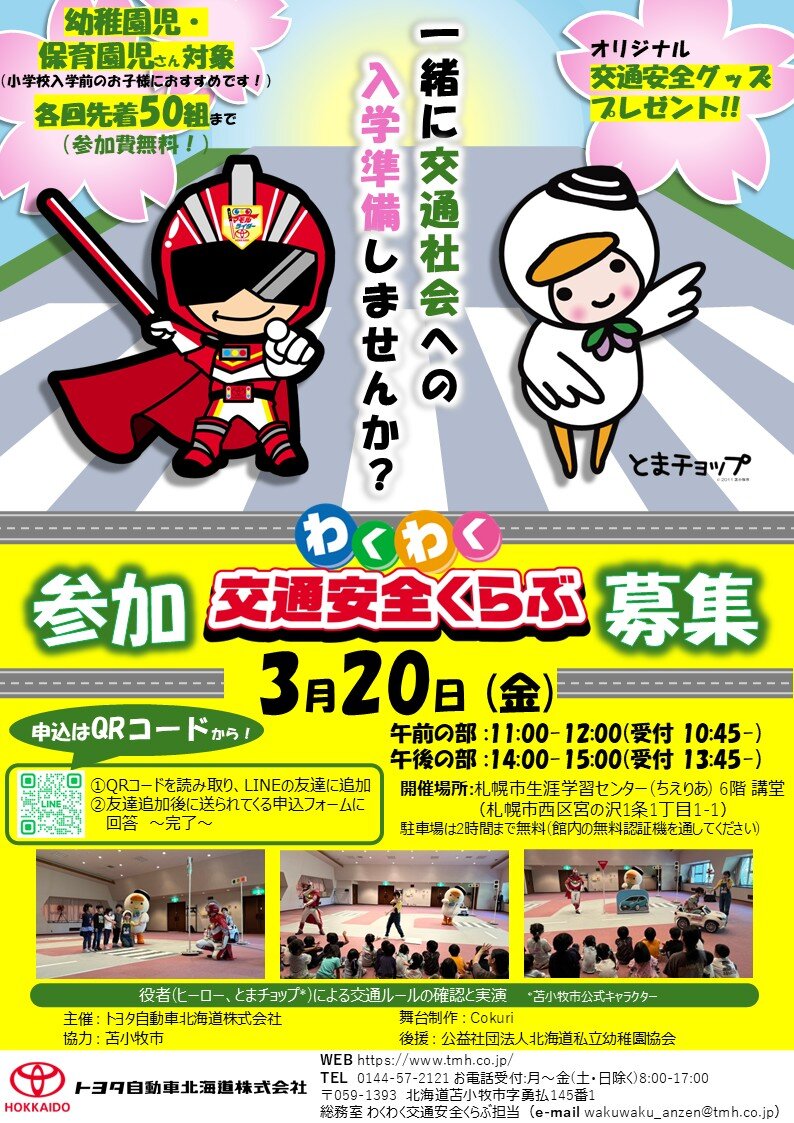 本公演は、苫小牧市の協力と北海道私立幼稚園協会の後援を受け、Cokuriの舞台制作により実施します。当社オリジナルヒーローの「トマモルライダー」に加え、苫小牧市のご当地キャラクター「とまチョップ」も出演し、楽しく交通ルールを学ぶことができます。